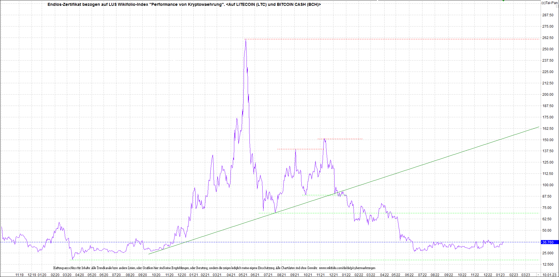 Anbei das Zertifikat, bekannt als: Endlos-Zertifikat bezogen auf LUS Wikifolio-Index "Performance von Kryptowaehrung",  jetzt versorgt mit Performance von Litecoin (LTC) und von Bitcoin Cash (BCH).