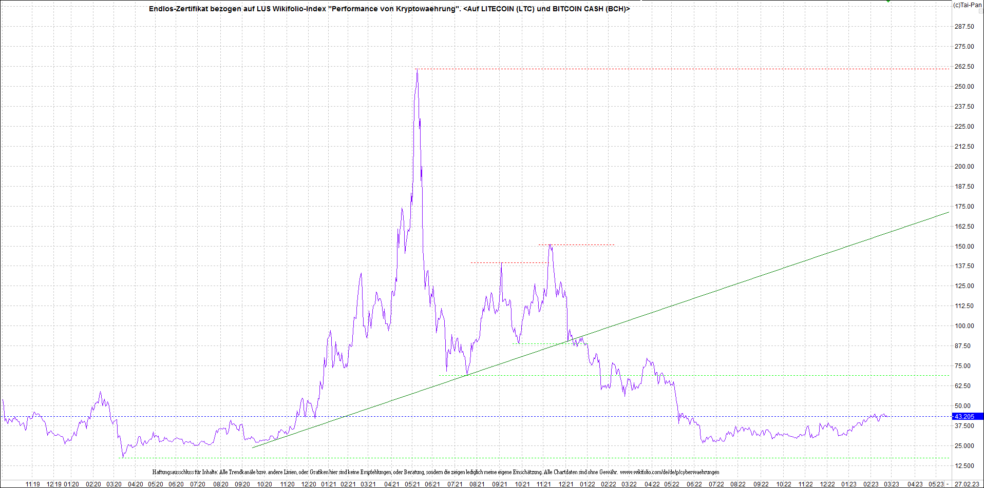 Anbei das Zertifikat, bekannt als: Endlos-Zertifikat bezogen auf LUS Wikifolio-Index "Performance von Kryptowaehrung",  jetzt versorgt mit Performance von Litecoin (LTC) und von Bitcoin Cash (BCH).