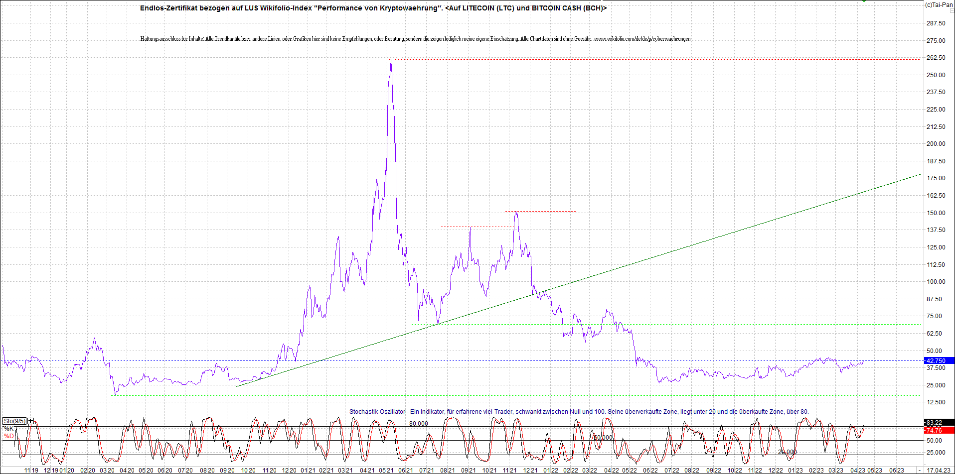 Anbei das Zertifikat, bekannt als: Endlos-Zertifikat bezogen auf LUS Wikifolio-Index "Performance von Kryptowaehrung",  jetzt versorgt mit Performance von Litecoin (LTC) und von Bitcoin Cash (BCH).