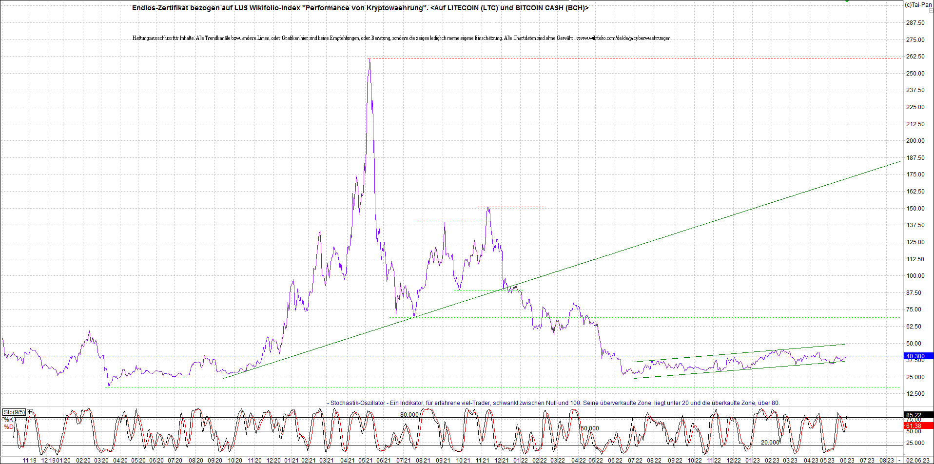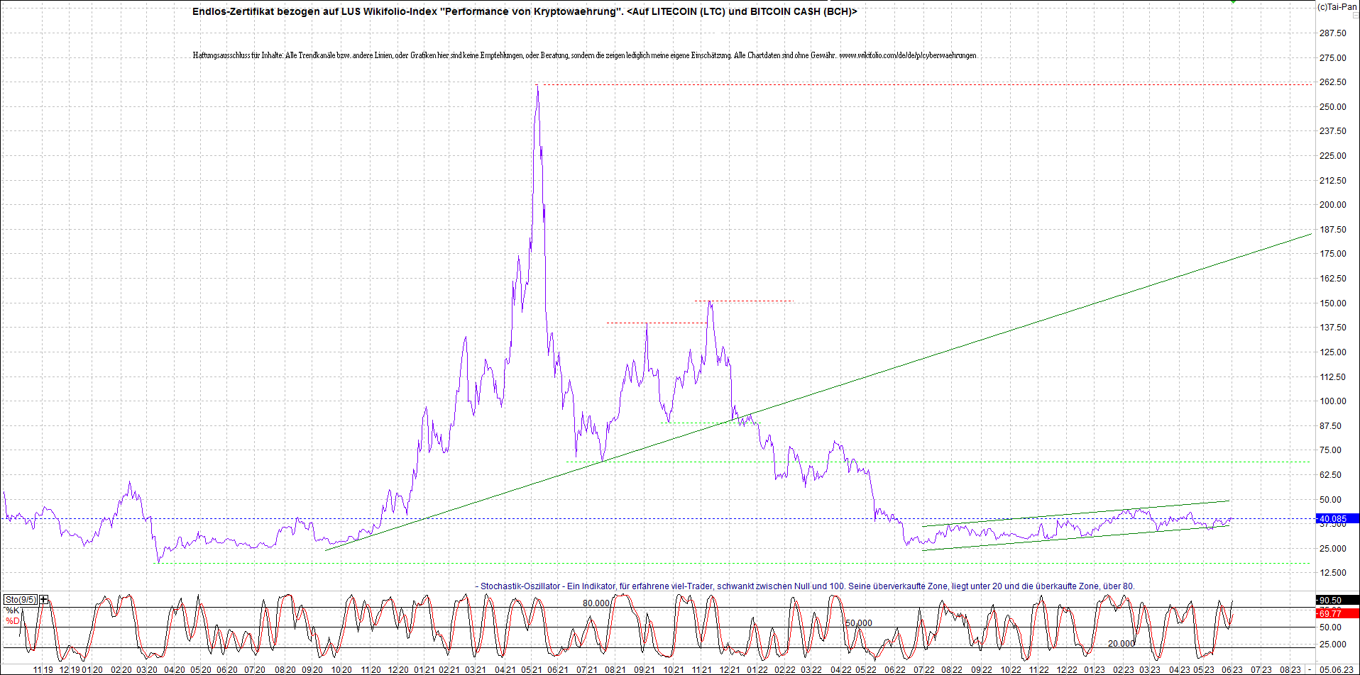 Anbei das Zertifikat, bekannt als: Endlos-Zertifikat bezogen auf LUS Wikifolio-Index "Performance von Kryptowaehrung", jetzt versorgt mit Performance von Litecoin (LTC) und von Bitcoin Cash (BCH).