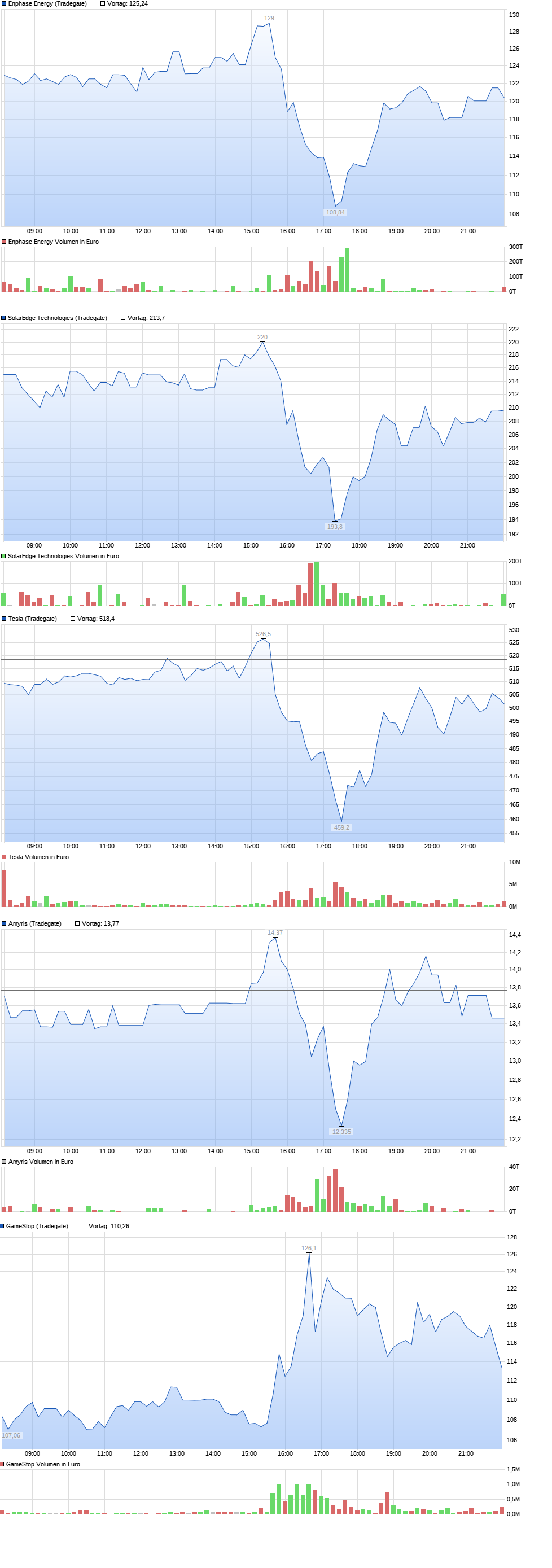 Die Daycharts von Enphase, Solaredge, Tesla, Amyris (beispielhaft gewählt, alles US-Techwerte) sehen sich sehr, sehr ähnlich. Habe mal statt NASDAQ lieber die Verläufe bei TRADEGATE angeschaut, x-Achse sind MEZ-Zeiten, Währung in Euro. Ich weiß, die Kurse werden in den USA gemacht, bei Tradegate sieht man es aber besser.