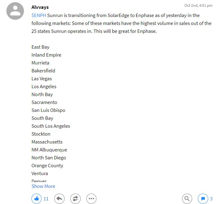 Meiner Ansicht nach beruht die hinter dem Kursverfall stehende Strategie genau darauf, selbst Langzeitinvestoren die noch gut im Plus sind durch den täglichen Blick auf den Chart zu zermürben. Der gewünschte Effekt ist, dass man sich denkt: Also eigentlich sind die Fundamentaldaten ja mehr als in Ordnung (und fossile Brennstoffe längerfristig auch nicht gerade im Aufwind), aber wenn das mit dem irrationalen Kursverfall jetzt immer so weiter geht, wärs vielleicht doch angebracht, mal eine Teilposition zu veräußern (solange man noch dick im Plus ist) und später wieder einzusteigen. - Diesen gewünschten Effekt wird die Abzockerfraktion zumindest bei mir nicht haben. Ich hab mich entschlossen, erst mal ein paar Wochen nicht mehr auf den Chart zu schauen, sondern mich bloß über die Entwicklungen bei Enphase selber zu informieren. Vor den Quartalszahlen bringt es meiner Meinung nach einfach nichts, sich immer nervöser machen zu lassen...