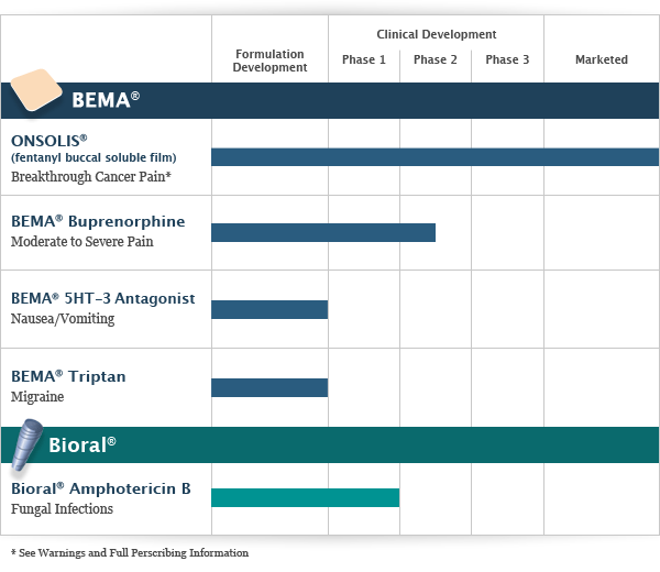 BioDelivery Sciences International (NASDAQ:BDSI - News) is a specialty pharmaceutical company that is leveraging its novel and proprietary patented drug delivery technologies to develop and commercialize, either on its own or in partnerships with third parties, new applications of proven therapeutics. BDSI is focusing on developing products to meet unmet patient needs in the areas of pain management and oncology supportive care. BDSI’s pain franchise currently consists of two products utilizing the patented BEMA technology. ONSOLIS (fentanyl buccal soluble film) is approved in the U.S., Canada, and the EU (where it is marketed as BREAKYL), for the management of breakthrough pain in opioid tolerant, adult patients with cancer. The commercial rights are licensed to Meda for all territories worldwide except for Taiwan (licensed to TTY Biopharm) and South Korea (licensed to Kunwha Pharmaceutical Co.). BDSI’s second pain product, BEMA Buprenorphine, is being developed for the treatment of moderate to severe chronic pain and is in development in a high dose formulation for the treatment of opioid dependence. Additional product candidates are being developed utilizing the BEMA technology for conditions such as nausea/vomiting (BEMA Granisetron) and migraine (BEMA “Triptan”). BDSI’s headquarters is located in Raleigh, North Carolina. For more information, visit www.bdsi.com.