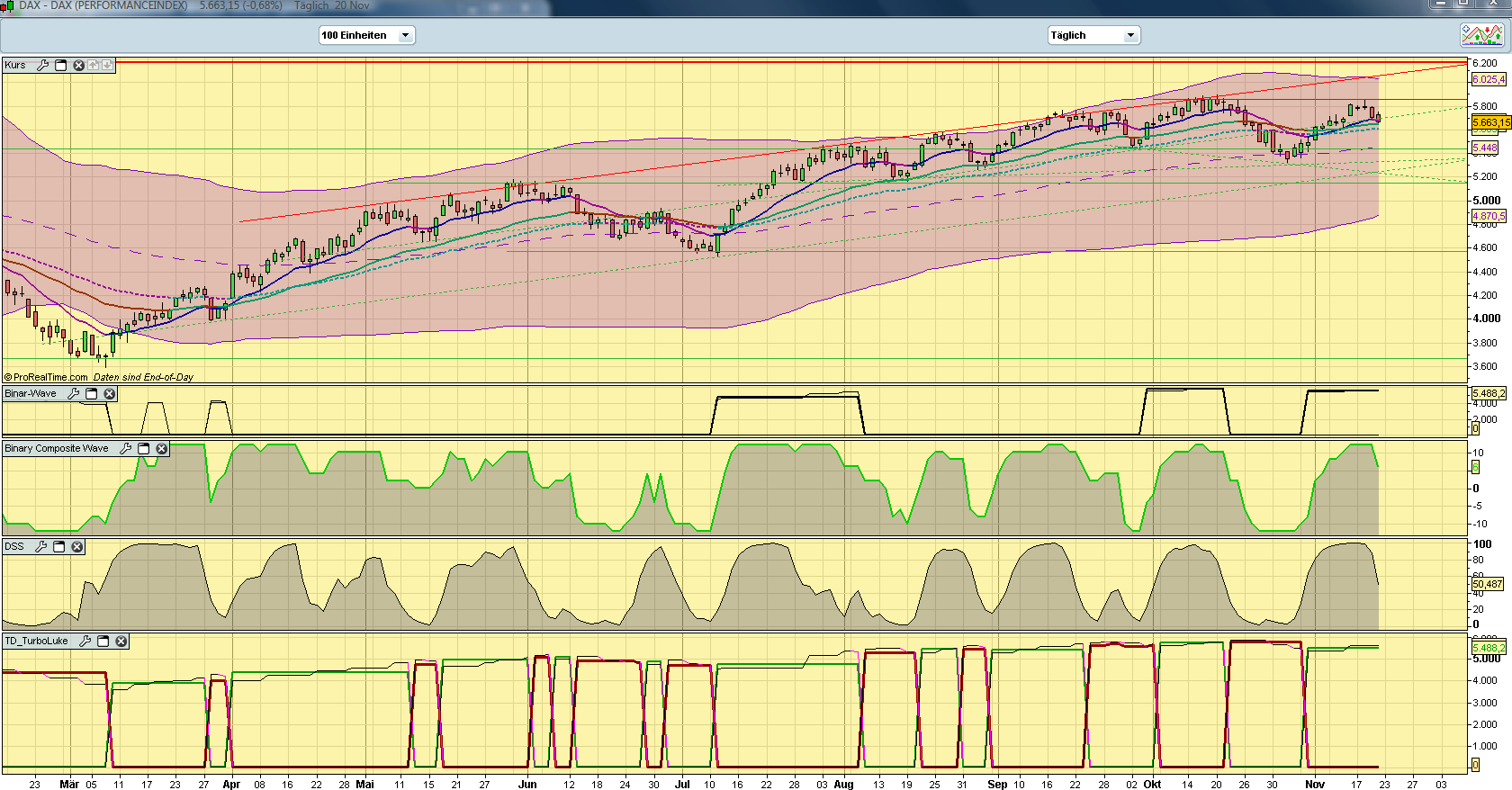 Im Prinzip waren die letzten Signale von TD ganz gut, was aber klar ist, weil wir einen starken Trend hatten. Ich vermute mal, deren MACD muss man nur in Haupttrendrichtung traden um einigermaßen gute Ergebnisse zu bekommen. Ein Vergleich mit meinem HS wäre interessant... Zumindest kann ich nun die Relevanz der Signale von TD ganz gut abschätzen. Insbesondere die Signale gegen den Haupttrend sind also leider nicht sehr sicher. Dem aktuellen Shortsignal messe ich daher wenig Relevanz bei. Nach meinem Gefühl kam das zu schnell, so dicht unter den US-Hochs.