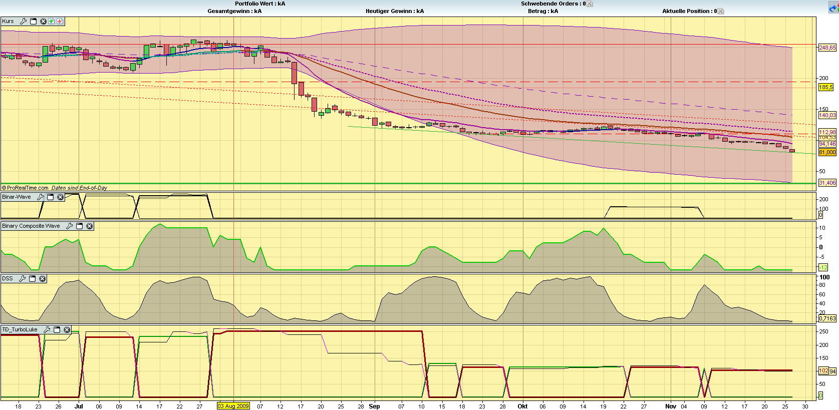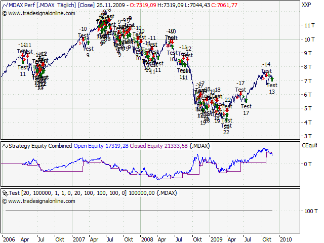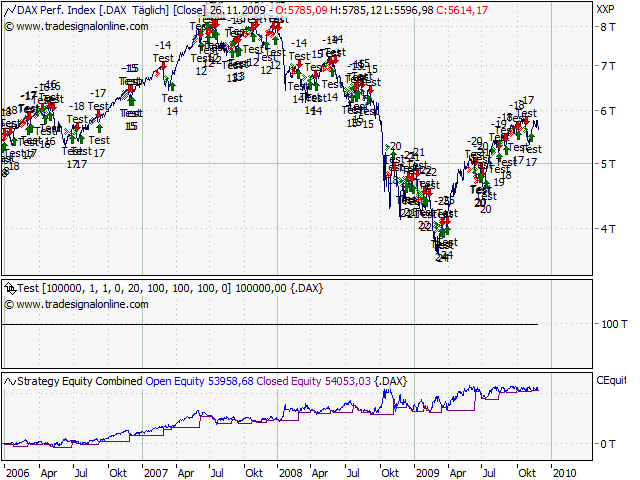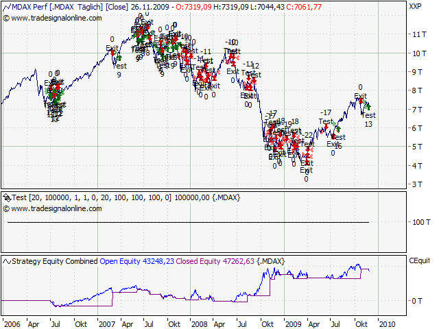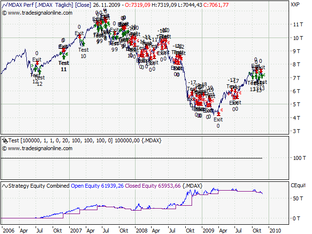 Mein Sys ist für diese Märkte zumindest besser geeignet. Ein Short-Signal gab es heute auch. Im Dax, MDAX, CDAX, CAC40, BEL20, AEX, FTSE, PSI. Kurzum: In allen Indizes, die heute gehandelt hatten. Eindeutiger geht es nicht. Hier mal die Darstellung des DAX. Bin am überlegen den Signalgeber in meinen Blog zu integrieren. Wie ist hier die Meinung dazu? Interesse?