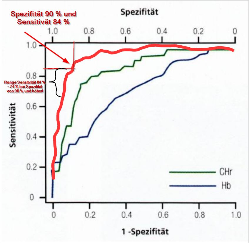 Ich habe in meiner unendlichen malerischen Fähigkeit dazu verleiten lassen, eine fiktive Kurve in Rot einzuzeichnen. Dies soll dem aktuellen Test von Epi entsprechen. Du sollst nur wissen, am Ende verschiebt man lediglich zu Lasten der Sensitivität (da haben wir eine Bandbreite, zur Erfüllung der CMS-Mindestwerte von 84 % - zu 74 % also 10 % Punkten). Da aber der Sensitivitätswert wichtiger ist, als der Spezifitätswert, hat man hier unter Einhaltung der CMS Vorgaben agiert.
