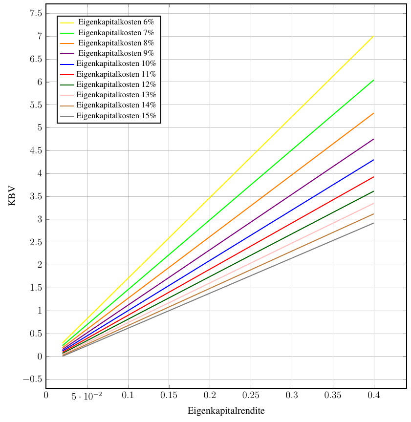 Jetzt könnt Ihr die Kreuzung mit dem aktuellen KBV suchen (etwa 4) und die notwendige Eigenkapitalrendite ablesen, die gerechtfertigt ist. Vergleicht das mal mit Henkel und Evotec...