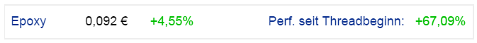 begonnen einen Teil meiner Einlage abzugeben, um mein Risiko zu minimieren. Das sagte ich ja auch vorab schon 'durch die Blume', sollte sie je .09+ im deutschen bid sehen, beginne ich damit. Habe jetzt fast kein eigenes Geld mehr investiert und es blieben wegen des hohen % Zuwachses ein schönes Paket freier epoxy shares ("freebies") übrig, da freu ich mich :)