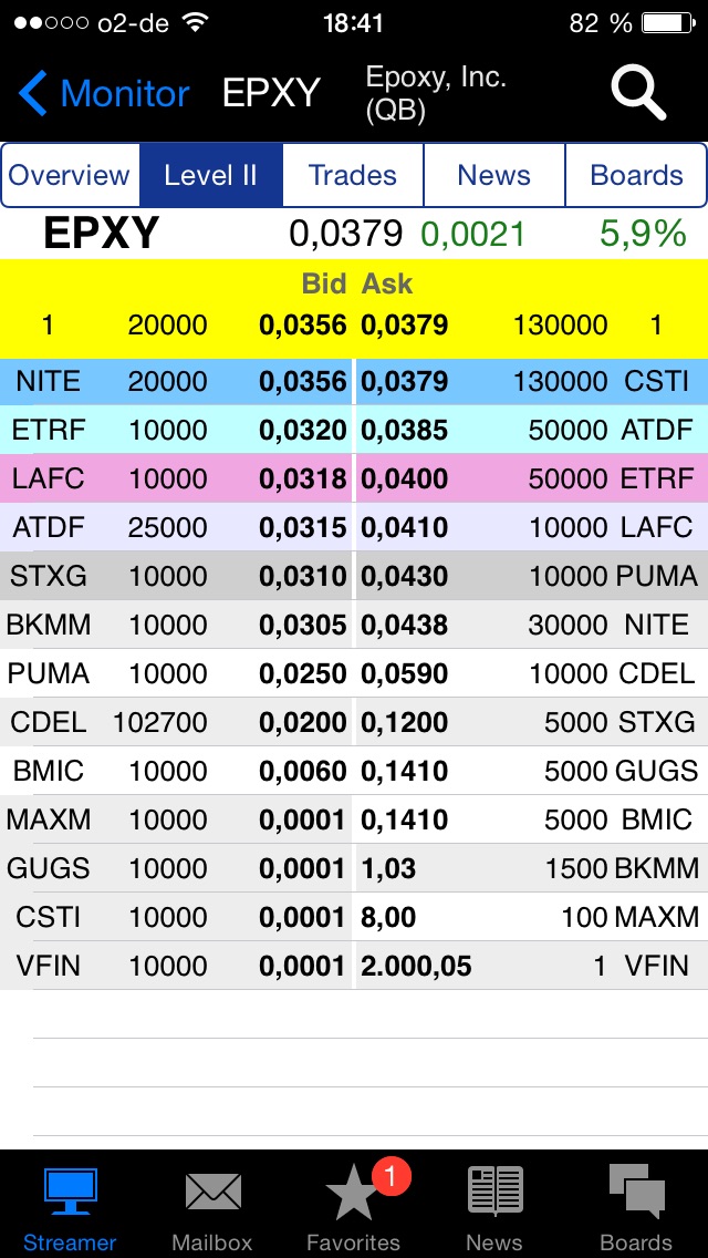 Und soweit bekannt ist wollten zahlreiche Investmentfirmen bei Epoxy einst mit bis zu 2 Cent je Aktie einsteigen, und dann bisher bis ca. 3 Cent. Doch liegt dieses Kauflimit nun auf ca. 4 - 5 Cent bzw. wird wahrscheinlich in der nächste Woche bzw. bis Jahresanfang auf ca. 6-7 Cent erhöht, d.h. das Epoxy allein deshalb in den kommenden zwei Wochen um ca. 50%-70% im Kurs zulegen könnte.Dazu kommt noch, dass es fast keine Aktien im Umlauf gibt. Ja, ca. 176 Mio. Aktien sind aufgelegt, doch die sind fast alle fest im Kämmerchen versperrt da praktisch jeder grössere Aktionär damit rechnet, dass Epoxy (EPXY) das nächste Facebook oder Twitter in seinem Marktsegment ist und dass die Aktie im Laufe der Jahre tatsächlich die USD 100,- Marke erreichen wird.