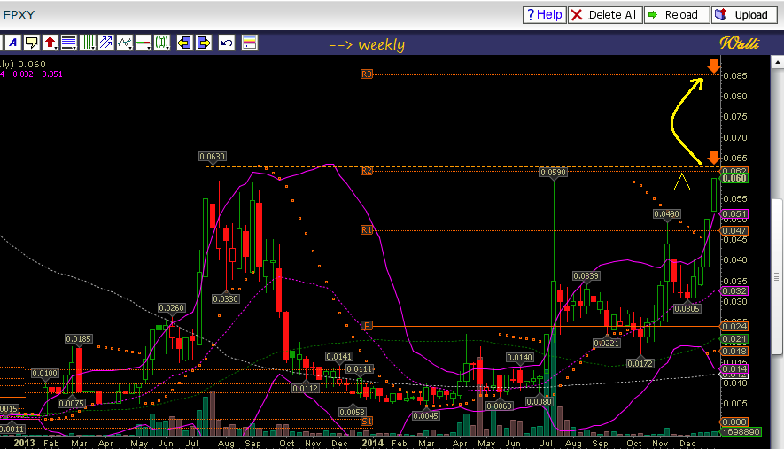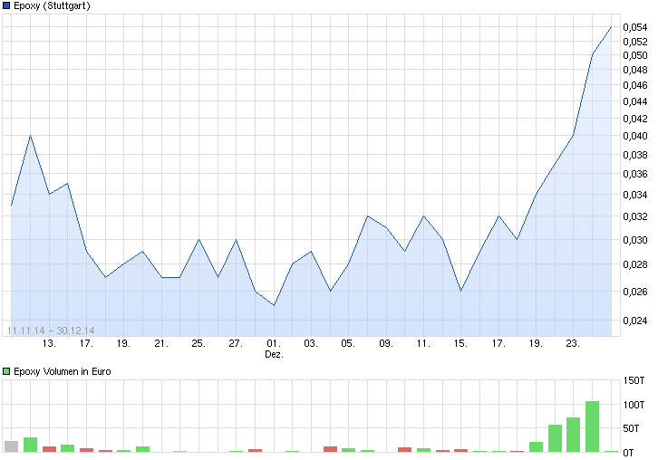 bohrt sich der Kurs durch die ~ $.062, ist Raum bis zum nächsten Widerstand, die $.085, arbeitet er sich durch den, geht der deutsche Geldkurs auf .07€ Das ist das erste Etappenziel. Dann kann man variabel Pakete werfen, für ~ +40% profits oder mehr, je nachdem, wie früh wer rein ist oder den Rest einfach unbefristet halten, solange der Chart insgesamt noch in Ordnung bleibt... die $.085 ist sozusagen der 'Außenposten', danach kommt nur noch deep space... der Rest ist sich konsequent nach dem Chart richten, wenn er den Eindruck erweckt, dass ein Penny im Abwärtstrend ist und bleibt (erspare mir das Bsp.), dann hält man es nat. nicht -99% lang und "jubelt" dabei bzw. schimpft auf die Skeptiker, sonst massakriert man sich ja praktisch selbst... und die anderen stehen drum rum und schmunzeln... alles erlebt, aber vollkommen abwegig... nicht verrückt machen lassen und den Chart genau lesen... von der Chartkonstellation, wie sie aktuell gegeben ist bei Epoxy, liegt die Eintrittswahrscheinlichkeit des brechens von Außenposten $.085 bei ~90%, meiner Meinung nach und die kann nat. vollkommen falsch sein, logisch. Wie es sich nun wirklich verhält, entscheidet der Markt. Prima. Guten Rutsch