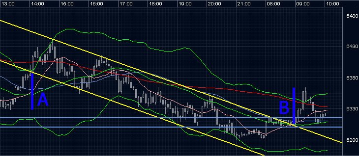 Hier also der Chart samt Erläuterung, wie das Ziel des Up-Moves von 9:15h errechnet wurde. Durch Ausbruch aus der morgendlichen Seitwärtsbewegung im Bereich 6.300 - 6.315 (blauer Trendkanal) nach oben wurde gleichzeitig die angesprochene Flagge (gelber Trendkanal) nachhaltig verlassen. Ziel der Bewegung war dabei der Bereich 60 Punkte über Flaggenausbruch. Dieses ergibt sich aus Strecke A, die von 6.328 bis 6.388 läuft. Als Strecke B ergab sich damit bei dem Start 6.305 folglich das Ziel im Bereich 6.365.