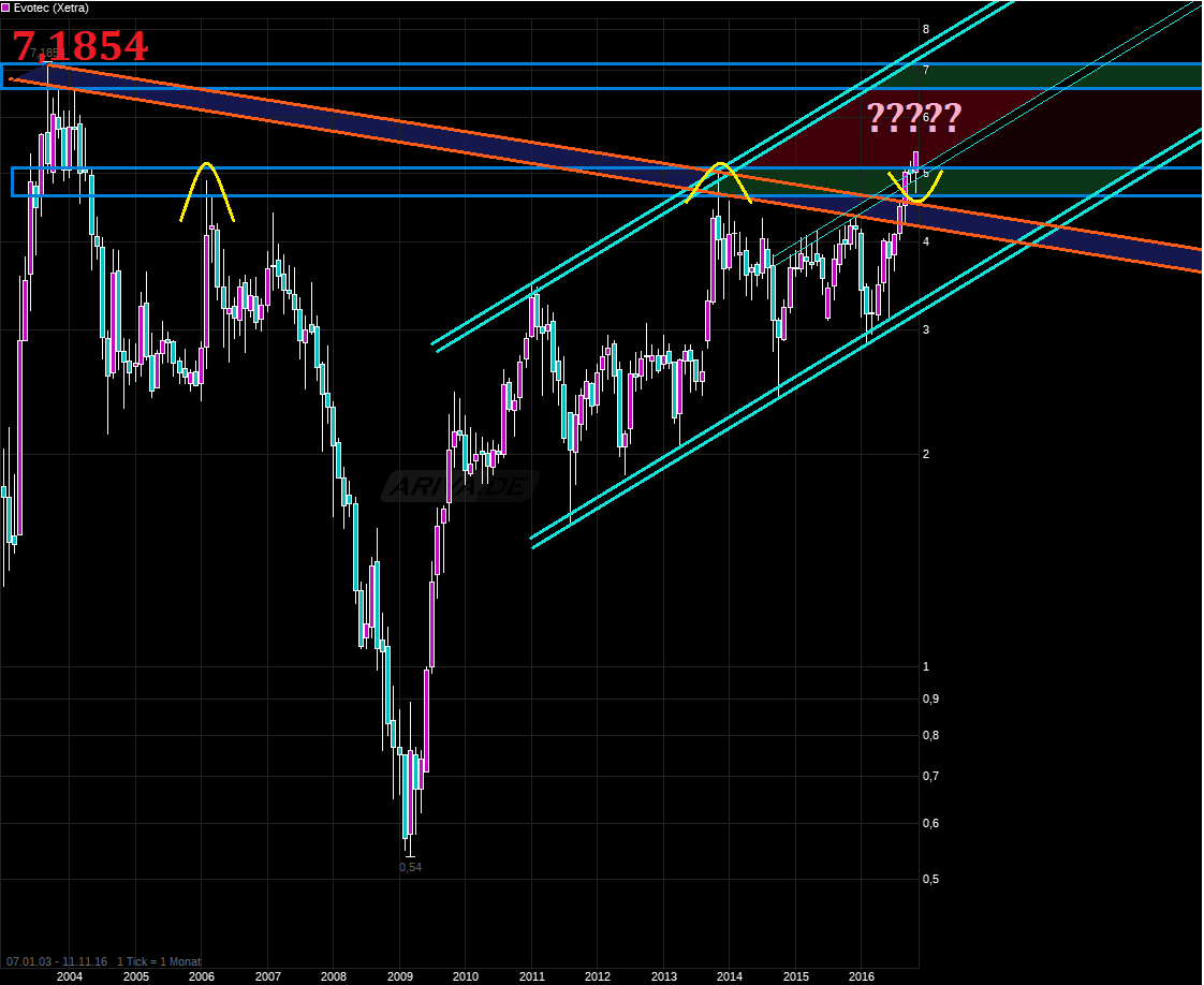 Evotec gab gestern Zahlen und weitere Meldungen heraus (s.o.) Diese tragen auch heute noch. Die Aktie testete im Februar 2016 den Aufwärtstrend seit August 2011. Nach einem Tief bei 2,86 EUR drehte der Wert stark nach oben. Ende September erreichte der Wert den Widerstand bei 5,08 EUR und damit das Hoch aus dem November 2013. Um dieses Hoch pendelte der Wert in den letzten Wochen. In dieser Woche bricht er offenbar nach oben aus.
