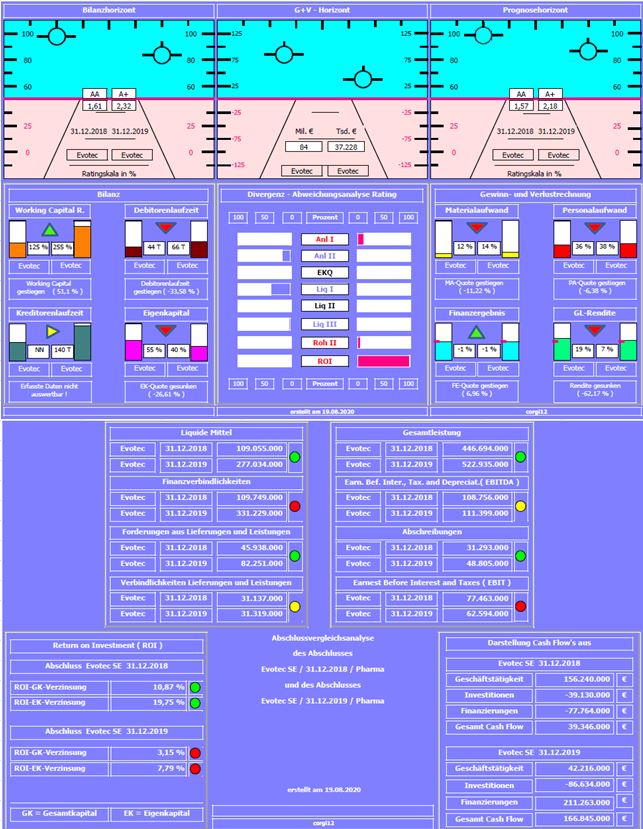 Negativ: Erstmalige Nettofinanzverschuldung ( ca. 50 Mil. € ), Return on Invest durch Aufnahme von Finanzmitteln und erstmalige Einstellung von Leasingverbindlichkeiten erheblich verschlechtert, Eigenkapitalquote um 15% Punkte (von 55% auf 40%) gesunken, Rohertrag leicht gesunken.