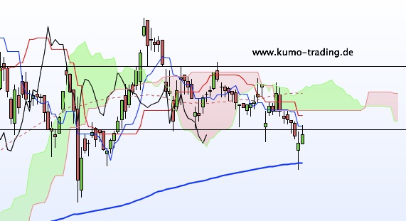 Fakt ist: Der Kurs notiert unter der Ichimokuwolke, unter Tenkan Sen und Kijun Sen (rote und blaue Linie). Die fortlaufende Kumo ist rot und Chikou Span (schwarze Linie) notiert unterhalb seiner Kerze.
