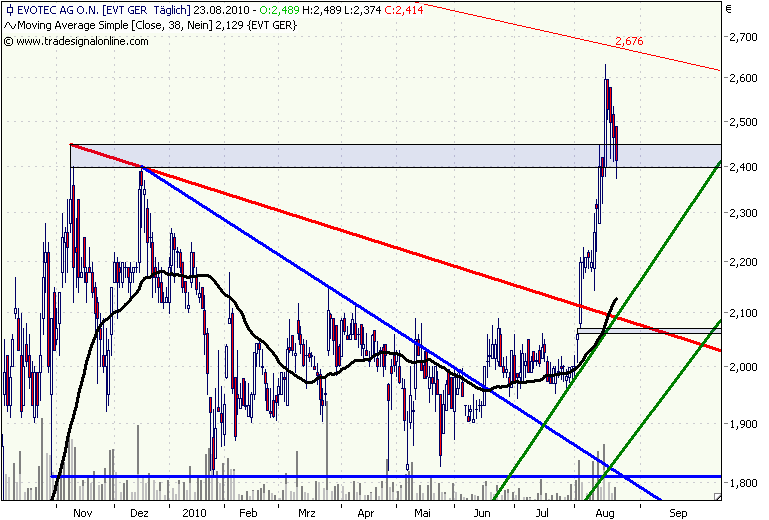 Die Aktie von Evotec legt in den vergangen beiden Wochen massiv zu. Nach dem Ausbruch in der vorletzten Woche über 2,09 Euro schoss die Aktie auf 2,63 Euro und damit fast an den Abwärtstrend seit September 2003, der aktuell bei 2,65 Euro verläuft.