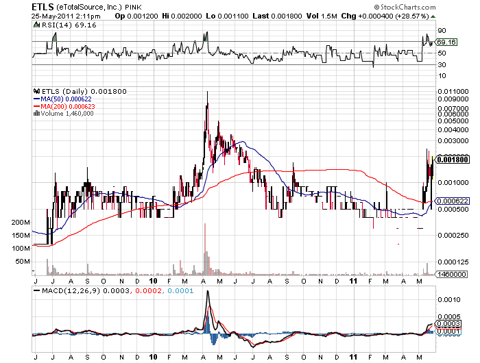 anfang. der chart hat verdammt große parallelen zu dem anstieg 2010. sieh dir das mal an. das ding fliegt uns die kommenden tage um die ohren. aber laut den super schlauen hier bin ich ja ein pusher. WNWG 2000% CDIPQ 1000% letzten monat. und ETLS ist die nächste.