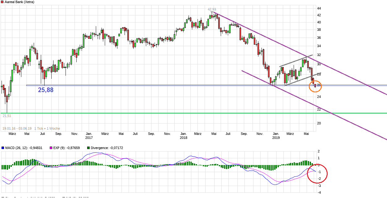 Die wichtigte Unterstützung ist also heute in diesem schwachen Marktumfeld gefallen intraday. Mal schauen, ob man auch auf SK nicht zurückkommt. Ich hatte ja sowas schon befürchtet (und bin trotz der verlockenden Kurse zuletzt nicht wieder rein) angesichts der vielen konjunkturellen/politischen Baustellen auf der Welt, die ständig größer werden statt kleiner. Gerade Finanzwerte kommen jüngst besonders unter die Räder. Man schaue z.B. nur wie die einst so stolze Deutsche Bank von Allzeittief zu Allzeittief weiter abschmiert und so auf dem besten Wege ist bald aus dem DAX zu fliegen. Streit USA/China nimmt kein Ende, BIP-Prognose wird immer weiter gesenkt, GroKo Unsicherheit kommt hinzu, Italien ist eh schon fest in Spinner-Hand ( Jetzt auch noch Italien-Ängste 03.06.2019 boerse.ard.de/marktberichte/...h-noch-italien-aengste100.html "...Eine neue Eurokrise würde dem wegen dem amerikanisch-chinesischen Handelsstreit politisch ohnehin angeschlagenen Markt wohl den Rest geben..." ). Keine leichte Zeit für Börsianer, zumal jetzt auch die traditionell schwachen Sommermonate vor der Tür stehen.