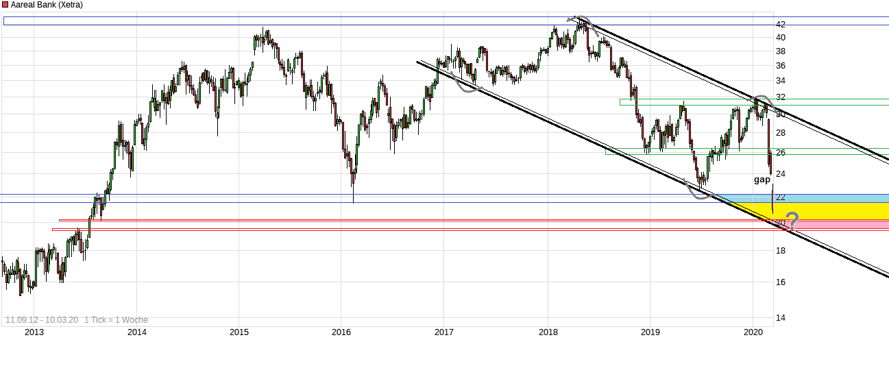 Muß jeder selber entscheiden, ob man in solchen Phasen größere Aktienbestände im Portfolio von Branchen will die am meisten leiden und noch eine ganze Weile leiden könnten. Ich schaue momentan wieder mehr nach Aktien und Branchen die im Paniksog undifferenziert zu weit mitgerissen wurden und von ihrem Geschäftsmodell her aber weitestgehend imun sind gegen Corona-Auswirkungen, Konjunkturabkühlung , Ölpreise, Zinsschritte, etc. . Das gibt zumindest eine gewisse fundamentale Sicherheit. Denn das Jahr dürfte noch insgesamt sehr unruhig bleiben, selbst wenn es Zwischenerholungen geben wird. Nachdem bei Aareal die stützende Region um 26 gefallen ist , hat man nun auch die Region von 22,50/23 unterschritten. War für viele Anleger ein weiteres Verkaufsignal. Da müßte man auch erstmal wieder stabil/nachhaltig darüber kommen, um Leute wieder etwas zu locken ( z.B. um auf einen Gap-Close zu wetten, wenn die Gesamtbörse sich mal etwas stärker wieder erholen würde.). Könnte jetzt sein, daß man erstmal jetzt noch bis zur Unterseite des schwarzen Abw.trendkanals läuft und dann eventuell einen Pullback macht Richtung 22,50/23,00. Ist aber alles schwer abzuschätzen, da die Märkte auf kurze Sicht extrem überverkauft sind und Erholung überfällig ist, auf der anderen Seite keiner absehen kann wie stark die weitere Corona-Dynamik die Leute noch wuschiger machen wird. Wir stehen in den USA und Europa ja eher noch am Anfang der Welle und wenn die Todeszahlen immer fixer ansteigen, dann werden auch die Menschen die jetzt noch so tun als wäre alles harmlos zunehmend anfangen zu grübeln. Wer glaubt mit wärmeren Temperaturen alleine wäre das Thema Corona final bald durch der irrt, denn der Mist kommt leider verstärkt ab Herbst wieder, was auch die Börsen und die Weltwirtschaft nicht beglücken könnte