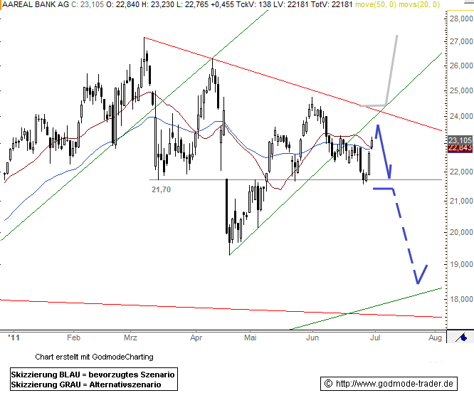 "Rückblick: Innerhalb ihres mittelfristigen Bullenmarktes ging die Aareal Bank Aktie im März diesen Jahres in eine durchaus volatile Konsolidierungsphase über. Hier zeigt die Aktie eine leichte Abwärtstendenz, wobei sich stärke Kauf- und Verkaufswellen ständig abwechselten. Zuletzt wurde dabei die kurzfristige Aufwärtstrendlinie der letzten Kaufwelle unterschritten, womit sich die Aktie nun wieder in einer Abwärtsbewegung befindet. Unterstützt wird dies durch Kursnotierungen unterhalb der beiden gleitenden Durchschnitte, womit ebenfalls ein leicht bärischer Markt auszumachen ist. Deutlicher Druck nach unten blieb hierbei bisher aber noch aus, wofür auch die horizontale Unterstützung bei 21,70 Euro verantwortlich sein dürfte. Auf dieser prallten die Kurse gestern deutlicher nach oben hin ab.