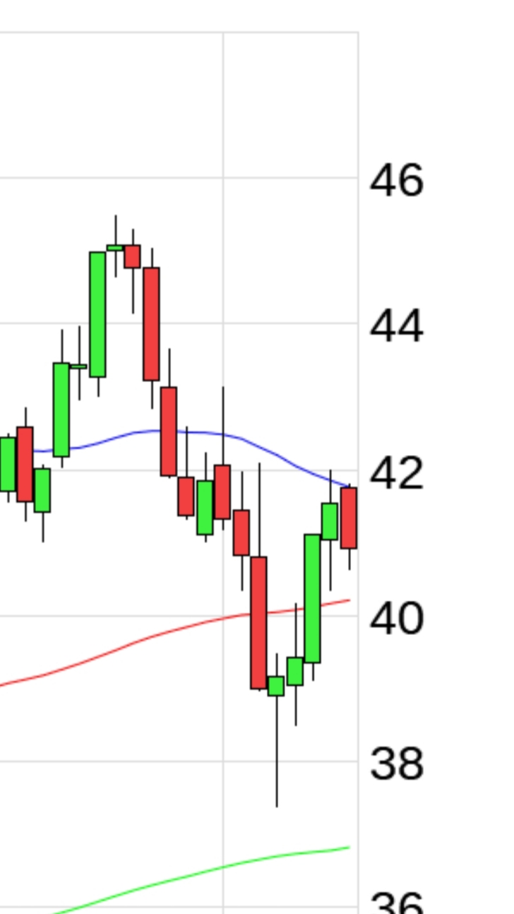 Chartauszug, Quelle Ariva Charttool, 1 Jahreschart, Chandlestick, linear, mit 38, 100 und 200 Tage Linie.