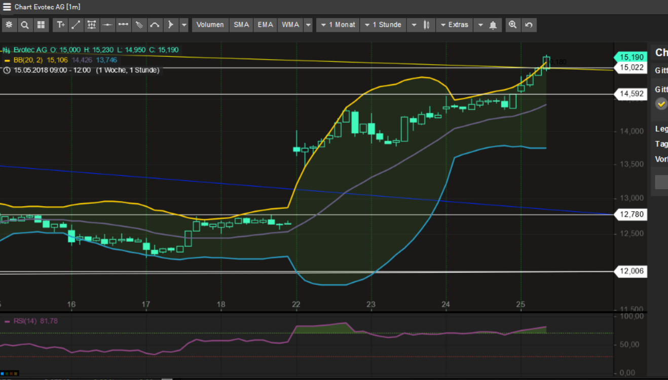 hier die nächsten res und subs im 4 std chart . rechts die weissen marken . wichtig wär das sich evo auf tageschluss über der 14.40 etabliert. evo baut auch übertreibung im bollinger band ab und vermeidet rückschläge die sich aus diesen übertreibungen ergeben würden .