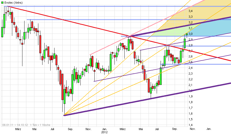 Ob da nun 3,01 oder 2,99 steht ist aus charttechnischer Sicht nicht so wirklich relevant. Da geht es bei so runden Zahlen mehr um den optischen oder psychologischen Effekt. Wichtig wäre sich nachhaltig über den Tops von März 2012 zu etablieren. Oben dürfte es ab ca. 3,15 aktuell eng werden, da dort z.Z. die obere Trendkanalbegrenzung des Aufw.trendkanals liegt der seit Aug.2011 steigt. Hätte natürlich nichts dagegen, wenn es gelänge in einen steileren Aufw.trendkanal überzugehen. Aber solange man diesen violetten Aufw.trendkanal nicht nach oben durchbricht sind das ungelegte Eier. Könnte auch passieren man bleibt in dem hellblauen Fächerabschnitt und wird erst gegen Jahresende an den obere Aufw.trendkanalbegrenzung stoßen im Bereich 3,24/25. Warten wird es ab und schauen auch mal was der Gesamtmarkt macht. Sollte DAX und TecDax nochmal in den nächsten Tagen etwas weiter konsolidieren, dann könnte es auch sein, daß man die 2 vor dem Komma noch etwas öfter zu sehen bekommt.