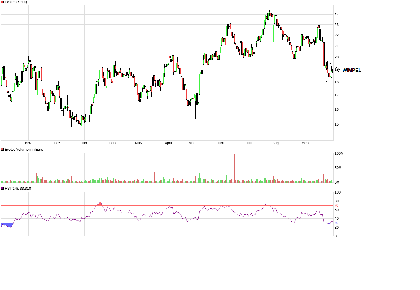 Die Tage, die Evotec heuer über 23 war kann man mit beiden Händen abzählen. Jeder Anstieg über 23 resultierte in einem Abverkauf um 15-20%. Aber klar, jetzt läuft es auf die 30 hoch, das bedeutet ein KGV für 2024 um die 90 und das für einen Umsatzwachstum von 20% und ein EBIT, das man 2018 schon hatte...