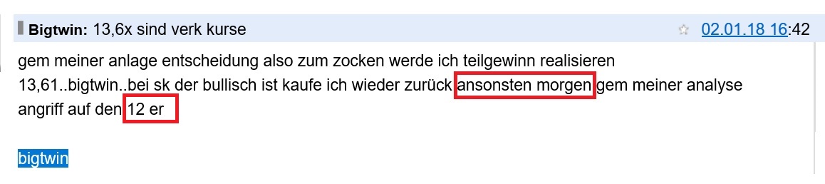 Ich wundere mich immer wieder über die gier der leute.....gestern 13.28 im tief...mein ek grins......und heute sind die leute bei 14,33 nicht bereit gewinne zurealisieren..obwohl einige schlaue user darauf hingewiesen haben....