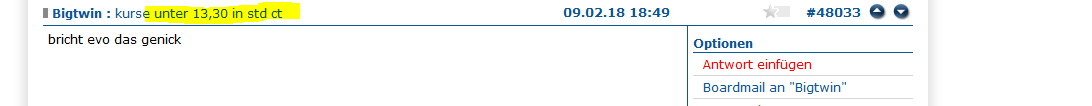 für mich lag es nun auf der hand ....und zwar immer parralell mit den dax betrachtet das es in de nb runter ging...der dax fast mustergültig....nur leider evo lief nicht in meinen erwarteten bereich von 12,xx...sondern hat sich wie geschrieben...zur jeder vollen std über 13,30 gehalten.....somit ein bullisches signal....und sehr wohl eines von mir erwähnte bullische szenario....