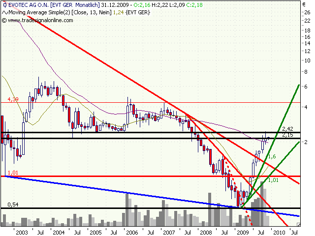 und versteh die Aufregung nicht. Zwar habe ich keine Ahnung, doch nach allem, was ich weiß, ist Evotec gerade am Ende einer schönen V-Formation mit Kragenbildung. Dürfte bei positiven Markteinflüssen also bald weiter Aufwärts gehen. Dabei gibt es eine steigende Unterstützungslinie bei etwas mehr als 2,00 EUR. Wird sie durchbrochen, dann Tschüß.