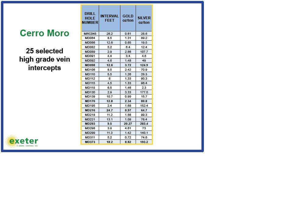Exeter's priority on its Cerro Moro high grade gold-silver property in Argentina is the Escondida vein where drilling has returned multiple intercepts of 12-18 g/t gold equivalent* over potentially mineable widths. The results from drilling to December 2008 will be used to produce a NI 43-101 compliant resources estimate, expected during the second quarter of 2009. Exeter will continue to develop its conceptual models so that on receipt of the resources estimate, it can advance the project to the scoping study level. We expect to re-commence drilling on the Escondida vein when permitting has been approved in early Q2, including possible extensions into the adjacent joint ventured Fomicruz lands.
