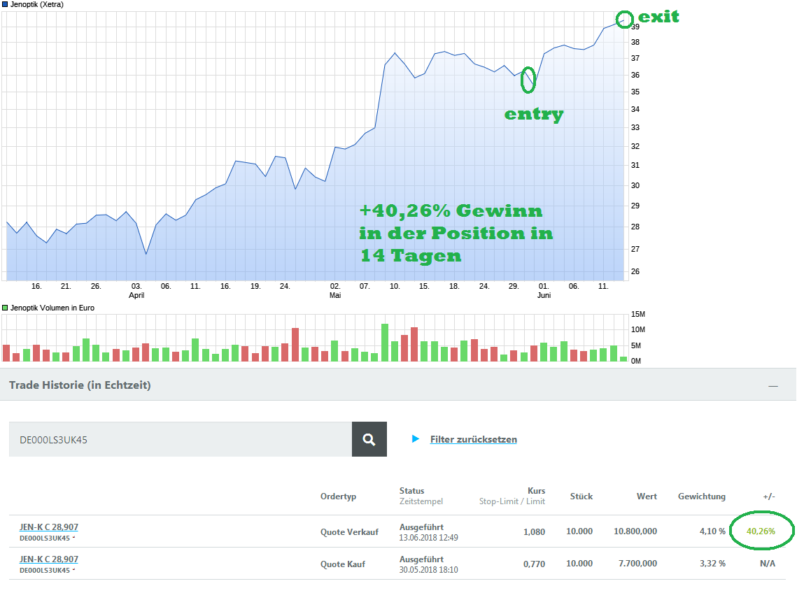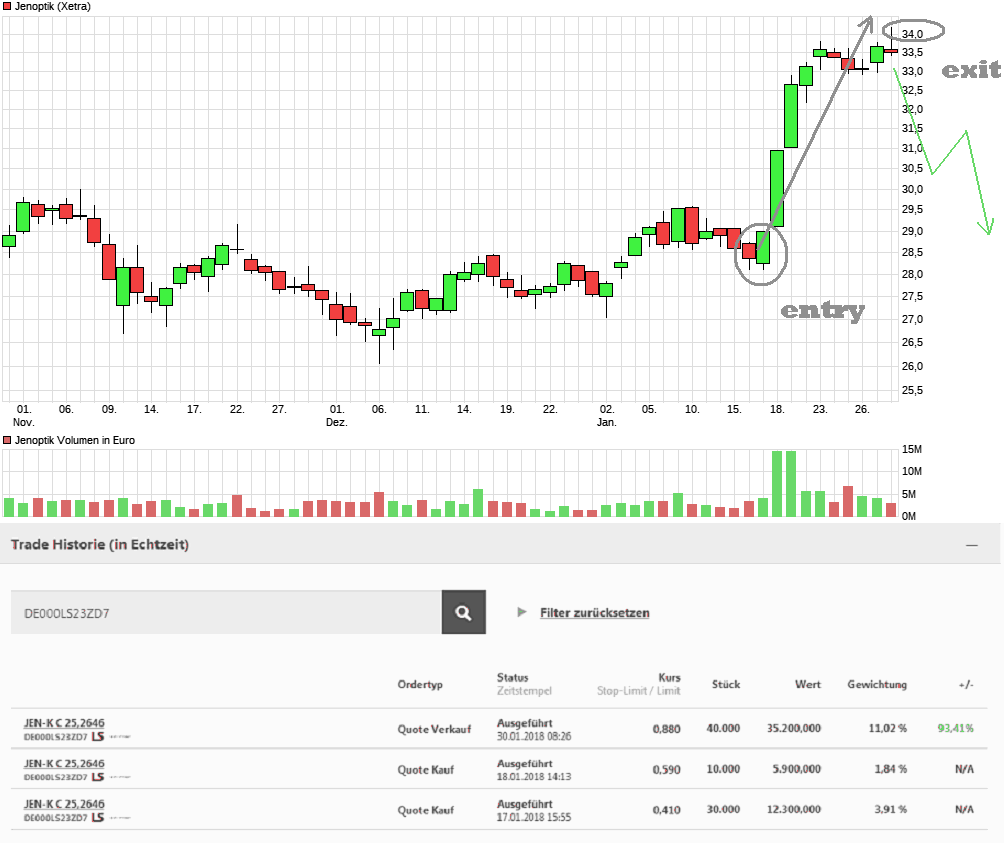 Jenoptik mit starker ENtwicklung seid mitte Januar. Aktuell wurde mein Ziel bei ca.34 Eur erreicht. Hier zeigt die Rallye auch erste Ermüdungserscheinungen. Grund genug für mich bei unsicherem Gesamtmarkt die Gewinne mitzunehmen.