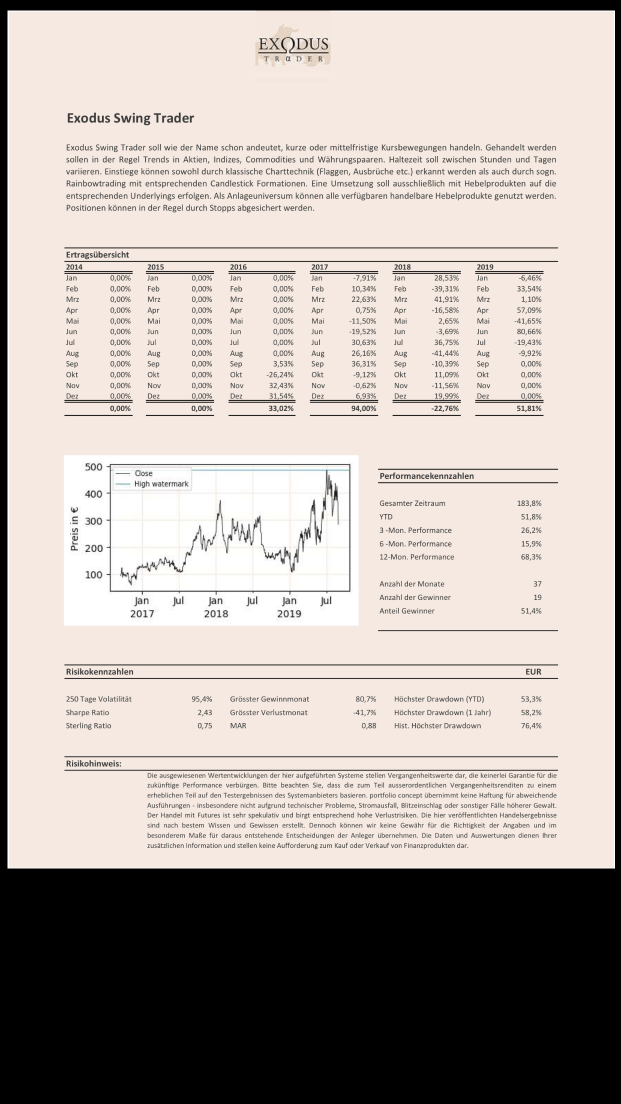 Exodus Swing Trader soll wie der Name schon andeutet, kurze oder mittelfristige Kursbewegungen handeln. Gehandelt werden sollen in der Regel Trends in Aktien, Indizes, Commodities und Währungspaaren. Haltezeit soll zwischen Stunden und Tagen variieren. Einstiege können sowohl durch klassische Charttechnik (Flaggen, Ausbrüche etc.) erkannt werden als auch durch sogn. Rainbowtrading mit entsprechenden Candlestick Formationen. Eine Umsetzung soll ausschließlich mit Hebelprodukten auf die entsprechenden Underlyings erfolgen. Als Anlageuniversum können alle verfügbaren handelbare Hebelprodukte genutzt werden. Positionen können in der Regel durch Stopps abgesichert werden.