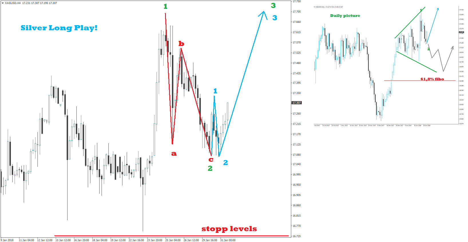 Ich gehe in Silber long! Trotz FED Entscheidung am Abend! Das Setup gefällt mir zu gut! Defensiver Stop um evtl. Vola auszuhalten.