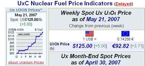 SXR Says (Update1) By Carli Lourens May 14 (Bloomberg) -- Uranium may more than double to $250 a pound next year as demand for the nuclear fuel outpaces production, according to SXR Uranium One Inc. ``We'll see resistance at around $200 to $250, where utilities will take some pain,'' Neal Froneman, Toronto-based SXR's chief executive officer, said in a May 11 phone interview from Johannesburg. ``Within a few weeks, you'll see it go to $130'' and $150 later this year, he added. Uranium prices have gained more than 10-fold in five years to a record $120 a pound as demand from power companies surges and stockpiles dwindle. SXR will become the world's second- largest producer of the metal, after Canada's Cameco Corp., when it completes the acquisition of UrAsia Energy Ltd. ``We expect fierce competition for those few remaining amounts of uncontracted uranium, leading to further price hikes and rising valuations of uranium mining companies,'' Mikhail Stiskin, an analyst at Troika Dialog in Moscow, said in a telephone interview on May 11. Shares of Cameco rose 19 percent this year, while those of SXR climbed 6.3 percent. The price of uranium gained two-thirds over that period, according to figures from Metal Bulletin. To contact the reporter on this story: Carli Lourens in Johannesburg clourens@bloomberg.net Last Updated: May 14, 2007 06:14 EDT