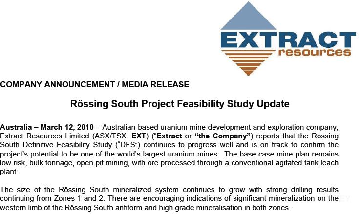 8:08 PM ET, March 4, 2010 MELBOURNE, Mar 04, 2010 (Dow Jones Commodities News via Comtex) -- Extract Resources Ltd. (EXT.AU) posted a net loss of A$13.4 million for the six months ended Dec. 31, compared to a loss of A$13.2 million in the previous comparable period. The Perth-based company, which is carrying out a feasibility study on the Rossing South uranium project in Namibia, said it had cash on hand of A$99.3 million at Dec. 31. -By Alex Wilson, Dow Jones Newswires;