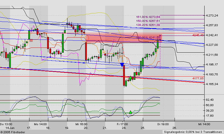 Moin moin...Traders, die US-Boersen scheinen derzeit keine Kauflaune verbreiten zu können, gemischte Quartalszahlen, die mögliche Irankrise, der Kältewelle und damit verbunden der Ölpreis lähmt die Anleger...nachbörslich kamen ganz ansehnliche Ergebnisse von NFLX (nb +15%), JDAS (nb +12%), SLAB (+22%), ALTR (+1,3%). Dau 10365, NDX 1480 und SPX 1163 stehen allesamt direkt an wichtigen Unterstützungen, Die Oszillatoren im kürzeren Bild lassen auch auf eine Zwischenerholung schließen. Alan G hatte bis zu 4,0 bil. US-$ zur Verfügung. Der Dax ging den vermuteten Gang und erholte sich von den Tiefständen, zum closing konnte er soch sogar noch über 4200 retten...2 Gaps haben wir schon, folgt heute das 3.Gap in Folge ? ...eher nicht, eines wird wohl geschlossen... (siehe EW-Chart*,