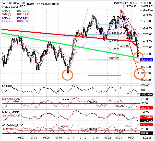 Schwächer haben sich die amerikanischen Märkte am Mittwoch aus dem Handel verabschiedet. Der Dow-Jones-Index für 30 Industriewerte (DJIA) verlor 1,1 Prozent oder 115 auf 10.012 Punkte und schloß damit auf dem tiefsten Stand des Jahres unter der Schlüsselunterstützung bei 10.020 Stellen. Nun sei im Prinzip Platz bis 9.933 Zähler, hieß es von Händlern. Der S&P-500 verzeichnete ein Minus von 1,3 Prozent oder 15 auf 1.138 Punkte. Der Nasdaq-Composite fiel um 1,0 Prozent oder 19 auf 1.914 Punkte.