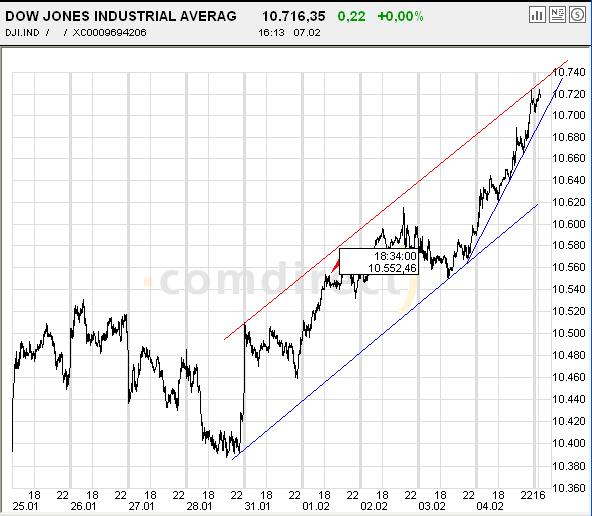 "Der Markt läuft dank positiver Vorgaben ruhig nach oben", sagte Nikolas Rothley von der BW-Bank. Faschingsbedingt seien die Umsätze allerdings weiter sehr ruhig, und lediglich in wenigen Einzelwerten sei der Handel aktiv. Daran dürfte sich auch am Dienstag nichts ändern; Rothley rechnet erst am Mittwoch wieder mit einer Belebung. Positiv wirke auch der gefallene Ölpreis und der weiter bröckelnde Euro zum Dollar, der die Stimmung weiter hoch halte.