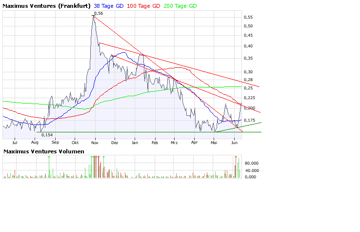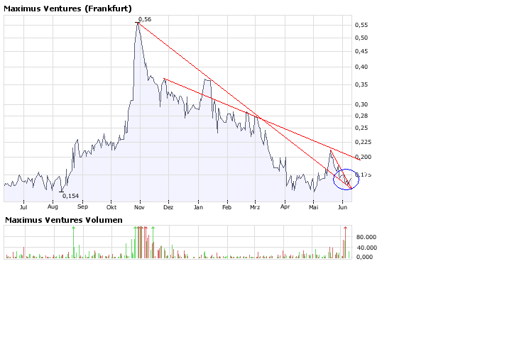 Charttechnisch tut sich bei den Aktien der Gesellschaft gerade in den vergangenen Handelstagen einiges. Das Handelsvolumen in den Aktien der MAXIMUS VENTURES ist an der Börse in Kanada förmlich explodiert. Herrschte vor einigen Tagen noch ein lustloser Handel, so hat sich dies mit der Bekanntgabe der vorläufigen Bohrergebnisse drastisch geändert. Die Aktien befanden sich zudem seit einiger Zeit in einer sehr lang anhaltenden Seitwärtsphase. Durch diese ausgedehnte Konsolidierung konnte der mittelfristige Abwärtstrend gebrochen werden und das hohe Handelsvolumen der letzten Tage könnte als ein zusätzlicher Katalysator fungieren. Charttechnisch wären somit schnelle Kurssteigerungen bis vorerst 0,30 € möglich. Sollte es vielleicht zu einer möglichen Übernahme kommen, dann würde sich das Szenario dramatisch ändern und ganz andere Kursregionen wären denkbar. Wir sehen charttechnisch vorerst Platz bis in den Kursbereich zwischen 0,35-0,40 € in den nächsten 3-6 Monaten.