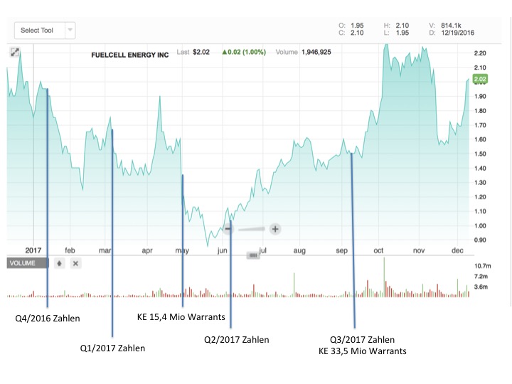 2. Am 14.12. wird aller Voraussicht nach eine KE mit der Erhöhung von 100 Mio zusätzlichen Aktien beschlossen werden. Normalerweise würde damit der Kurs stark einbrechen, es sei denn, dass die Aktien nicht frei gehandelt, sondern an neue, solvente Teilhaber ausgegeben werden würden (Exxon, Toyota, NSG, EON). Dieses dürfte dann zu einem weiteren Kursanstieg führen - meine Schätzung auf min. 3 $. Der Kurs könnte einigermaßen stabil bleiben, wenn man in diesem Zusammenhang nur weitere Projekte präsentieren würde (ca. 20MW werden erwartet) aber keine neuen Teilhaber. Sollte es keine positiven Nachrichten geben und nur die KE kommen, wird vermutlich 1,5 $ nicht mehr zu halten sein und wir werden in 2018 weiter warten müssen, dass sich der Kurs auf die 2 $ erholt und hält.