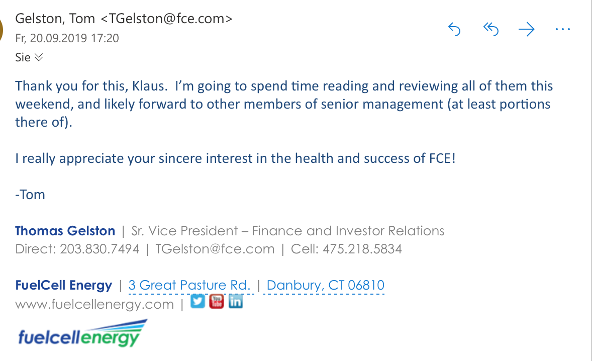 Große Energieversorger wie Shell und Eo-n sind natürlich grundsätzliche Ansatzpunkte, insbesondere nachdem Shell angekündigt hatte, der größte Anbieter von Ökostrom werden zu wollen. Dieses kann nur im dreistelligen MW-Bereich Sinn machen und dafür sind eigentlich nur die Anlagen von FCE geeignet.