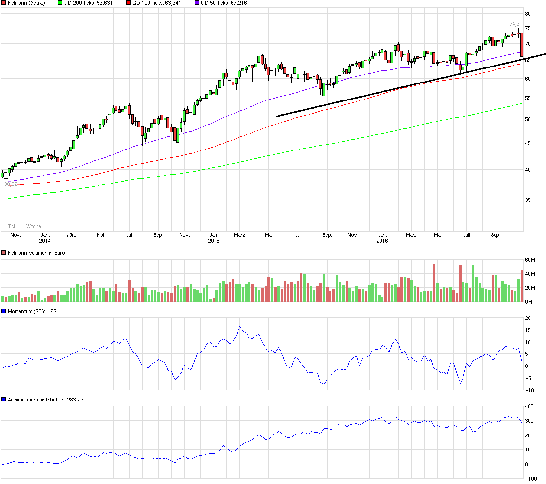 Das Abwärtspotential sehe ich bis 65 - 66 € begrenzt, hier wartet eine Trendlinie, die sicherlich ein dickes Brett darstellt, da sie seit Frühjahr 2013 ca. 7 mal getestet wurde.