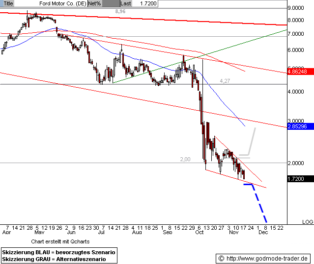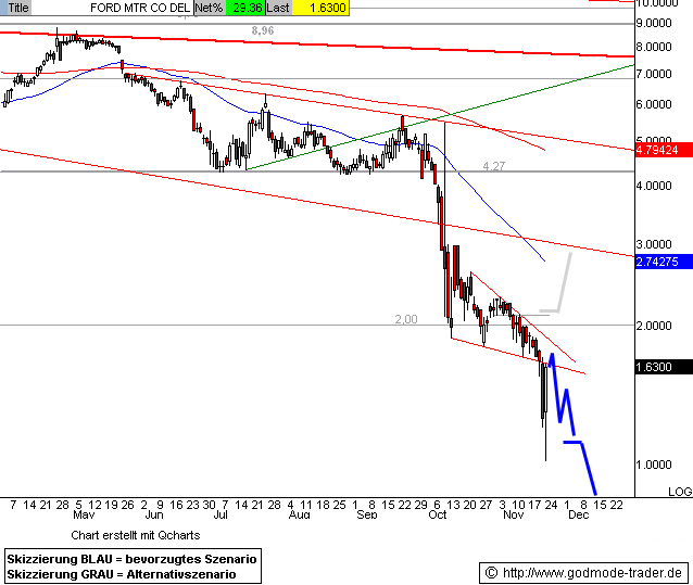 Rückblick: Die Ford Aktie befindet sich in einem langfristigen Abwärtstrend, es ist seit Jahren erheblicher Verkaufsdruck zu spüren. Eine deutliche Kurserholung in 2007 wurde wieder komplett abverkauft, die Aktie rutschte bis an den Unterstützungsbereich der Tiefs aus 1990/91 bei 4,27 - 4,59 $ zurück.