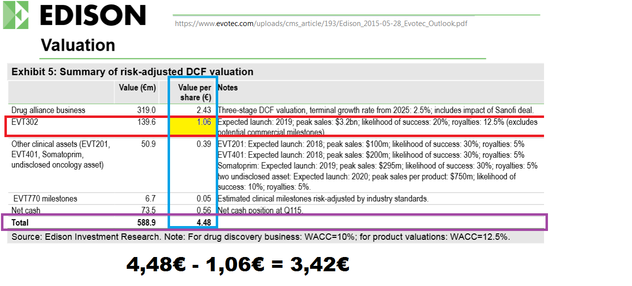 Ich habe zumindest zu 3,34 heute zur Eröffnung nachgekauft....weil eben da Nachrichten kommen könnten ;) Auch ohne EVT302 könnte man inzwischen Evotec nach dem SanofiDeal aus der Summe der Teile exEVT302 noch locker einen Wert von 3€ jederzeit zugestehen, selbst wenn ich nochmal über 10% des Wertes abschlage den Edison zuletzt genannt hatte: