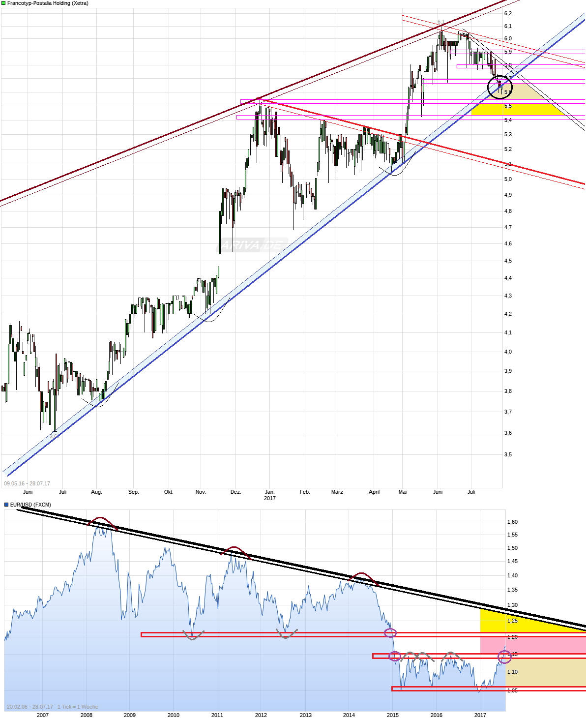 der 17er Prognose vielleicht jetzt in den Kurs schon ein? Scheint aktuell als hätte man jetzt doch den Aufw.trend gebrochen, der seit Sommer 2016 anstieg. Der weiter anziehende US-Dollar hinterläßt offensichtlich hier auch seine Spuren, wie schon im Gesamtmarkt. Seit Jahresanfang ist der Dollar nun schon um ca. 12% schwächer geworden gegenüber dem Euro und mit den jüngsten Ausbruch aus Seitwärtsrange könnte der Dollar noch weiter Richtung des nächsthöheren Widerstandes bei ca. 1,19/21 ziehen oder im ungünstigen Fall sogar noch höher Richtung des seit 2008 fallenden langjährigen Abw.trends. Da müßte FP wohl schon währungsbereinigt klar wachsen in den USA und sonstigen Regionen, um diese laufende ungünstige Währungsbewegung klar zu überkompensieren. Da bislang eh nur ein geringes Umsatz-&EBITDA-Wachstum für 2017 prognostiziert wurde seitens des Mangements vor einigen Monaten (unter der damaligen Annahme eines da noch vorteilhafteren Dollars als er sich nun darstellt), könnte angesichts des bei FP klar über 40 Mio. Euro liegenen Umsatzes in den USA hier somit in der Summe am Jahresende vielleicht eher Stagnation beim Umsatz&EBITDA ergeben, je nachdem wie schnell und weit der Dollarverfall sich noch weiter fortsetzt. Von daher bin ich mal gespannt wie konservativ FP bei Präsentation der Hj.1 Zahlen diesen neuen Umstand berücksichtigen wird beim Prognoseupdate bzw. auf welches €/$ Verhältnis man diese Prognose dann neu beziehen wird ( alte Prognose vor Monaten => cdn1.scrvt.com/...c06f1ccaf2/FP_Quartalsmitteilung_Q12017.pdf PROGNOSE: FP-KONZERN PLANT LEICHTEN ANSTIEG VON UMSATZ UND EBITDA : Das Unternehmen bestätigt nach dem guten Jahresauftakt seine Prognose. Der FP-Konzern erwartet für das Gesamtjahr 2017 unter der Prämisse gleichbleibender Wechselkurse einen leicht steigenden Umsatz und ein leicht steigendes EBITDA )