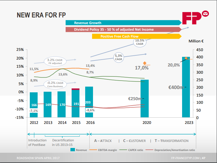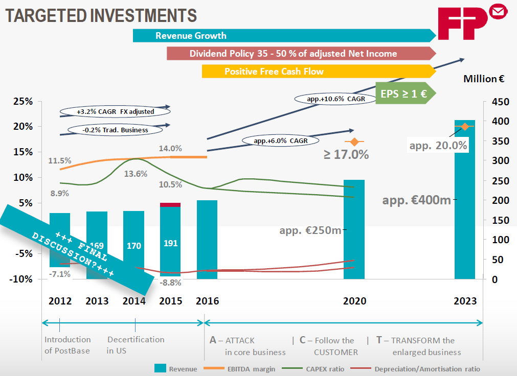 Das war ja im Grunde auch nicht anders zu erwarten. Umsatzwachstum kriegt man nicht umsonst. Dafür muss man investieren. Trotzdem hatte ich als Aktionör gehofft, dass FP dem Finanzmarkt mal das eigentliche Potenzial auf der Ergebnisseite zeigt. Da wäre 2019 optimal gewesen, denn wenn dann der Umsatz sagen wir bei 220-225 Mio € liegt, die Abschreibungen aber nur bei 13-14 Mio €, dann wäre das EPS schon 2019 wohl auf 0,7-0,8 € explodiert, einfach durch die enormen Hebeleffekte. Durch die neue Wachstumsstrategie, die ich wie gesagt durchaus begrüße, werden wir aber wohl weiter keine sinkenden Abschreibungen sehen und daher vorläufig nur leicht überproportional steigende Gewinne. Und das ist insofern ärgerlich als das die meisten Anleger einfach dieses Vertrauen in den Vorstand nicht mitbringen. Wieso auch? Daher könnte es in den Foren weiterhon heißen, wieso sollte man FP eine höhere Bewertung zugestehen, wenn das EPS weiter bei 30-40 Cents in 2017/18 dümpelt und 2019 nur leicht auf vielleicht 47-50 Cents steigt? Der Vorstand muss einfach klarer machen, wieso man diese Aktie kaufen sollte. Sich einfach nur hinzustellen und zu meinen, man wolle auf 3-4 Jahre bzw. auf 6-7 Jahre diesen oder jenen Umsatz und Marge erzielen, kann es ja nicht sein. Wieso sollte man dem Vorstand vertrauen, dass das auch geschafft wird? Und vor allem, was bringt das alles wenn unterm Strich die erhofften Hebeleffekte nur begrenzt auftreten? Vielleicht sollte der Vorstand neben Umsatz und Ebitda-Marge klipp und klar sagen, welche operativen, freien Cashflows und Ebits und Überschüsse er ja nach Wachstumsphase erwartet. Dass sich das je nach Präsentation ändert, ist ja auch schon wieder so ein Zeichen, wieso die Anleger misstrauisch sind. Wenn FP nicht aus meiner Sicht so günstig bewertet wäre, wäre ich wohl schon ausgestiegen. Aber die Chancen sind halt weit höher als die Risiken.