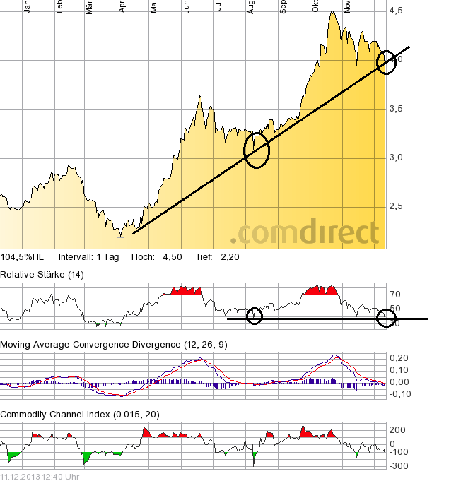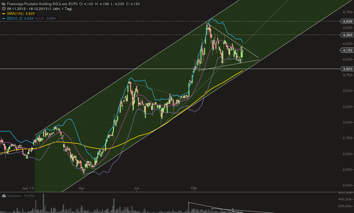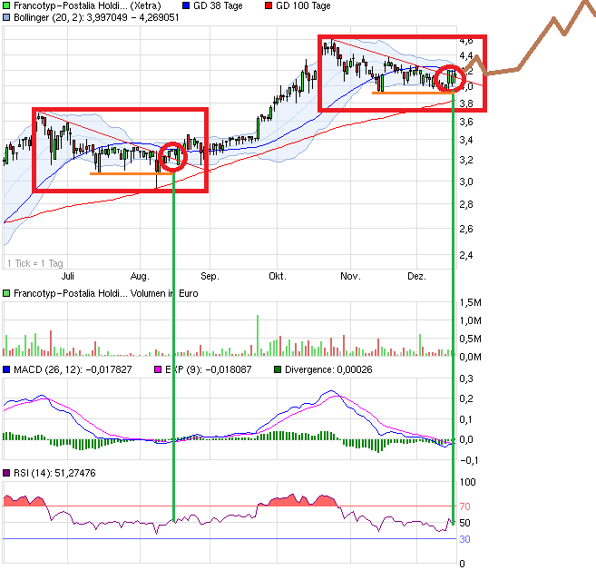 Was die Charttechnik angeht, ist das natürlich ne blöde Situation. Man steht etwa am Aufwärtstrend, aber der Bereich bei 3,85 € und die 100TageLinie wurden noch nicht getestet. Das ist eigentlich der letzte Downer, den ich bei FP noch erwartet hatte, ähnlich wie Anfang August als damals auch nochmal ein neues kurzfristiges Tief intraday an der 100TageLinie erreicht wurde und es dann wieder hoch ging. Wenn es jetzt genauso kommt, wäre das zudem der Test des 2011er Hochs bei 3,85 €, der vielleicht entscheidenen Unterstützung, was man im 6-7 JahresChart noch besser sehen würde.