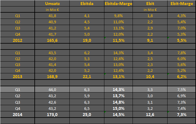 - Umsatz steigt im ersten Quartal 2014 um 2,1 Prozent auf 44,4 Mio. Euro