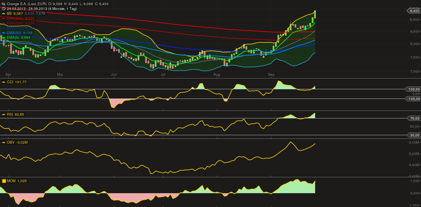 Orange - Vivendi - Bouygues liefen ganz gut in den letzten Tagen. Kurstreiber aktuell der geplante spinn-off von Vivendi und die Verhandlungen über die Zusammenlegung der Netze von SFR und Bouygues Telecom.